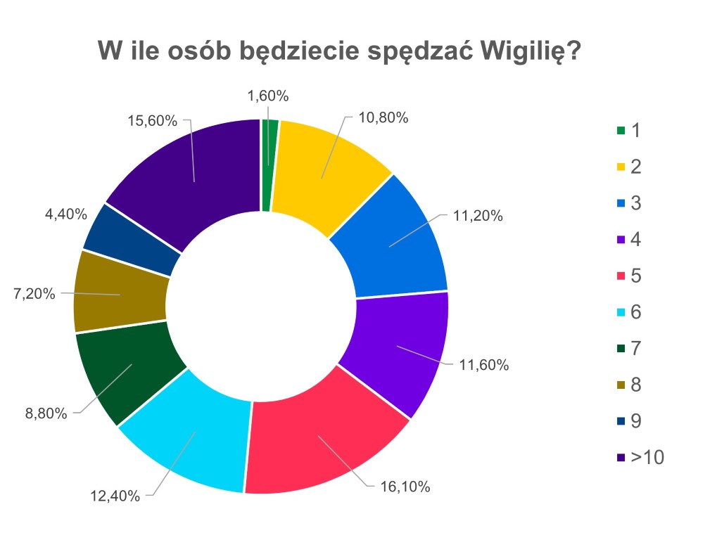Również rodzinne spędzanie Wigilii jest popularnym zwyczajem ankietowanych. Ponad 48% z nich ugości przy wigilijnym stole 6 lub więcej osób (rok temu 43%), w tym ponad 15% spędzi Wigilię w ponad 10-osobowym gronie (rok temu 15,5%).