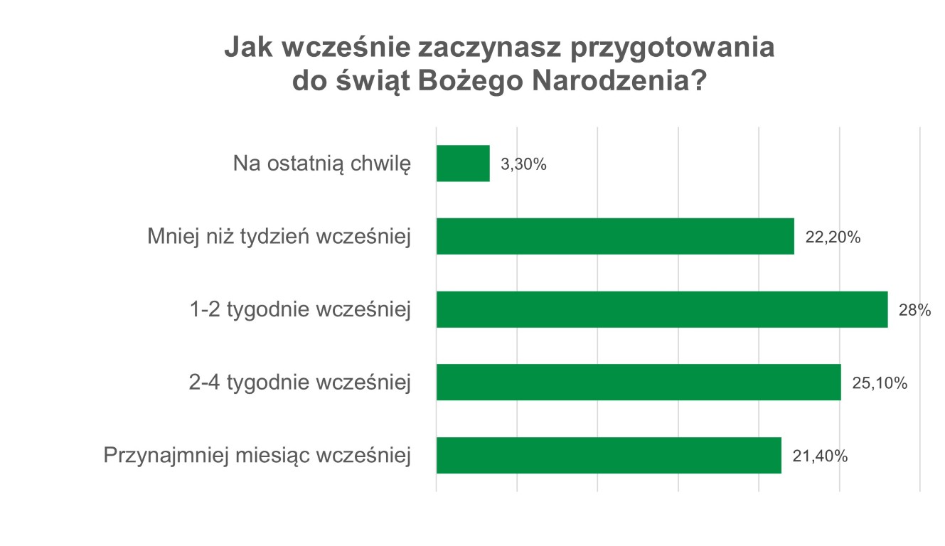 Aby ograniczyć stres związany z zakupami, warto zrobić je z dużym wyprzedzeniem. 21,5% ankietowanych przyznało, że zaczyna przygotowania do Świąt przynajmniej miesiąc wcześniej, a prawie 53% zaczyna 2-4 tygodni przed Świętami.