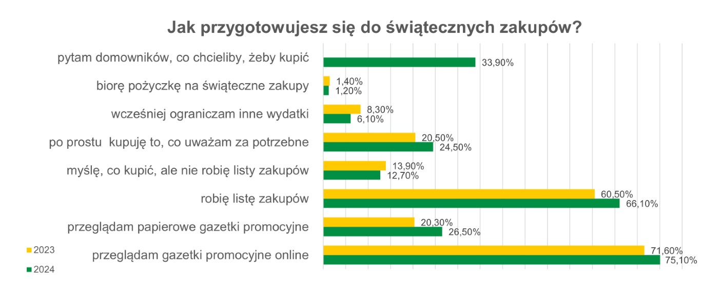 W porównaniu z 2023 rokiem, kiedy 41% wskazało zakupy jako źródło stresu, widać utrzymującą się tendencję ankietowanych do stresowania się świątecznym maratonem po supermarketach.