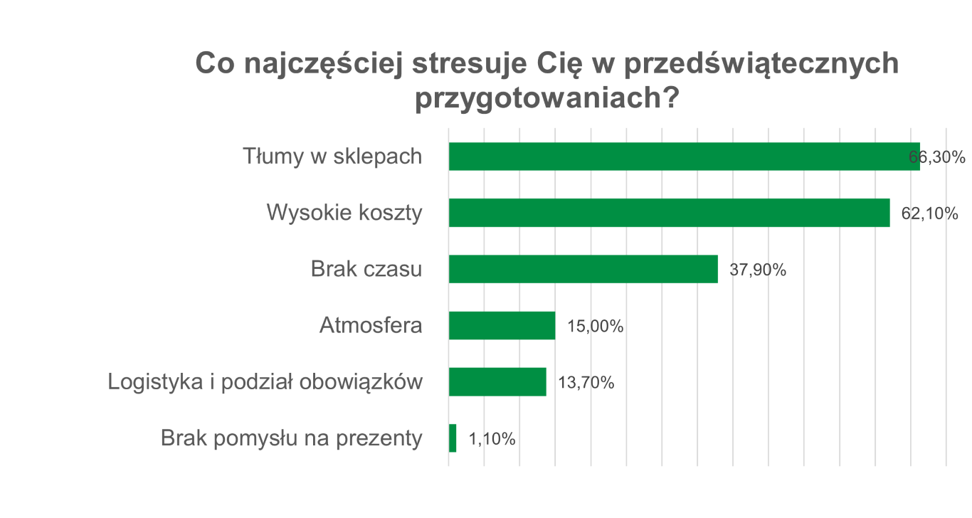 Wśród najbardziej stresujących aspektów zakupów wymieniano tłumy w sklepach (66%), wysokie koszty (62%) oraz brak czasu na przygotowania (37%).