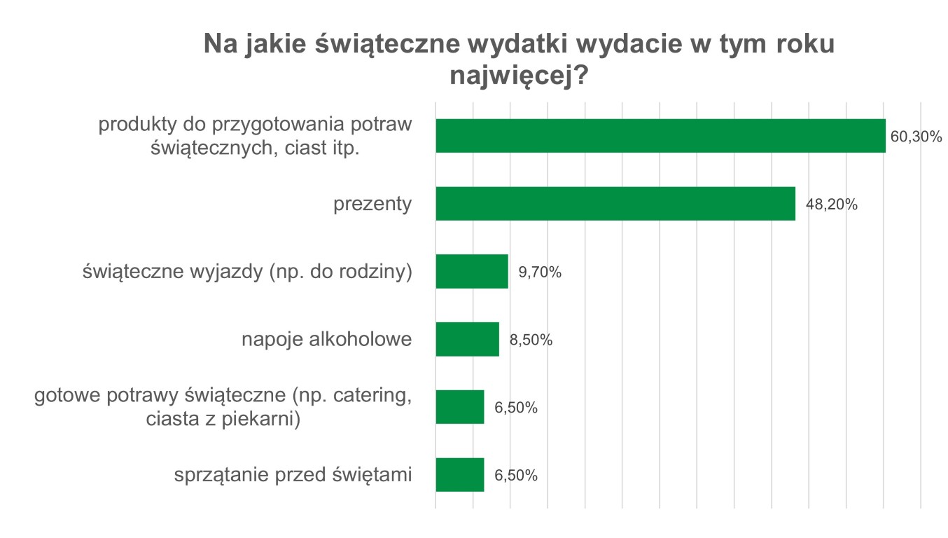 Nie zaskakuje, że ankietowani największą część świątecznego budżetu wydadzą na produkty do przygotowania potraw (60%) i prezenty (48%).