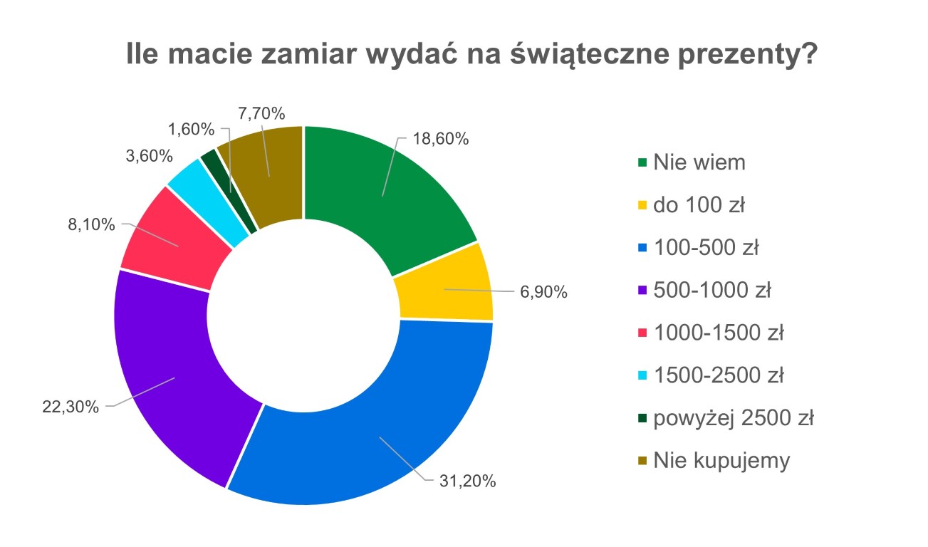 Jak natomiast wygląda budżet na prezenty? Podobnie, jak w przypadku jedzenia, najpopularniejsze zakresy kwot to 100-500 zł (31%) oraz 500-1000 zł (22%). Zeszłoroczne wyniki są podobne.