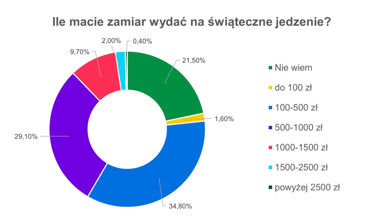 A ile Polki i Polacy mają zamiar wydać na świąteczne zakupy spożywcze? Najczęściej (35%, rok temu 42%) 100-500 zł oraz 500-1000% (29%, rok temu 26%). Jak widać, część osób w tym roku może pozwolić sobie na więcej. 21,5% jeszcze nie wie i nie potrafi określić przybliżonej kwoty