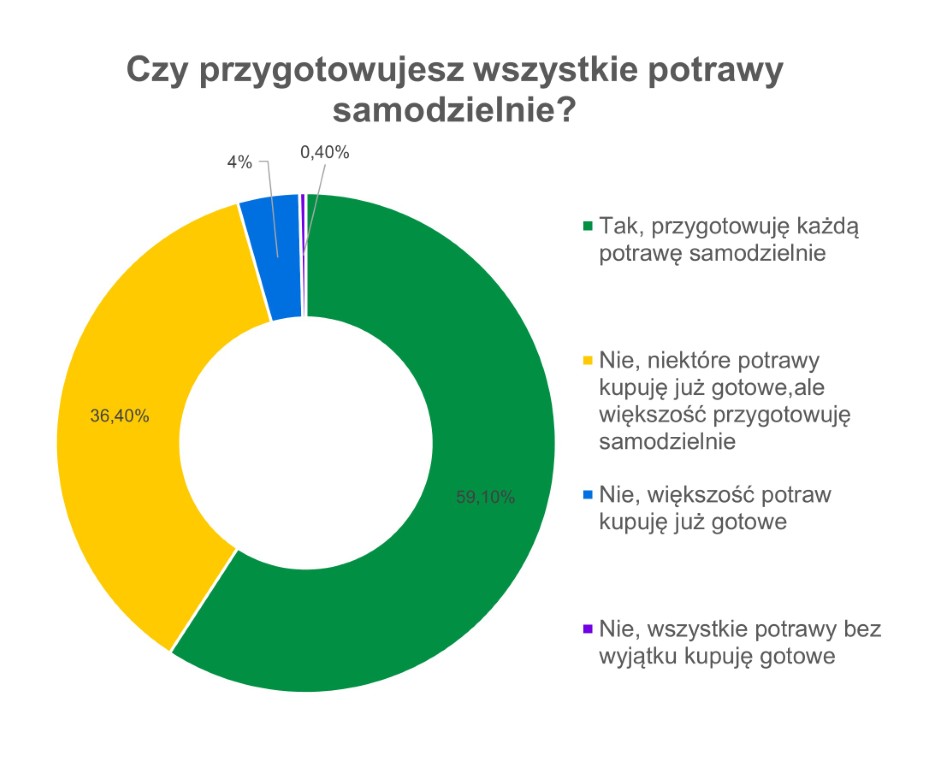 Jednym z ciekawych wniosków płynących z ankiety jest popularność samodzielnego przygotowywania potraw. Aż 59% ankietowanych deklaruje, że wszystkie dania na ich stole są efektem własnej pracy, co pokazuje, że dla wielu osób Święta to również czas zaangażowania w tradycje kulinarne.