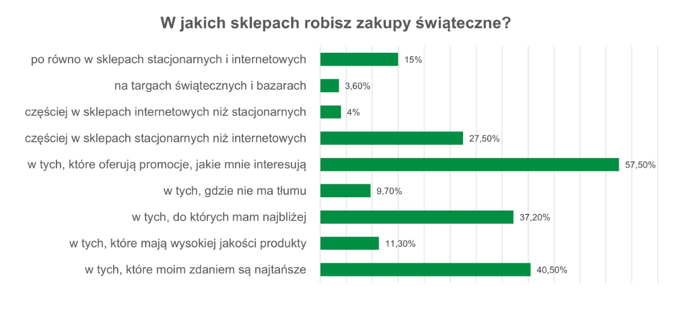 Jeśli chodzi o miejsce robienia zakupów, wygrywają sklepy, które oferują najlepsze promocje (57,5%). Przed rokiem również promocje były wyznacznikiem dobrego miejsca na zakupy, jednak osób, które zwracały na to uwagę, było więcej, bo 68%.