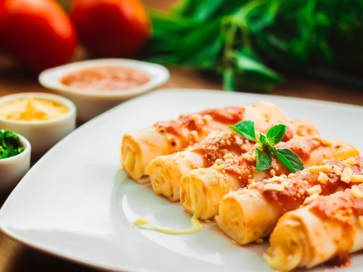 - Na każdy płat makaronu nałóż porcję farszu i zawiń, tworząc caneloni.
