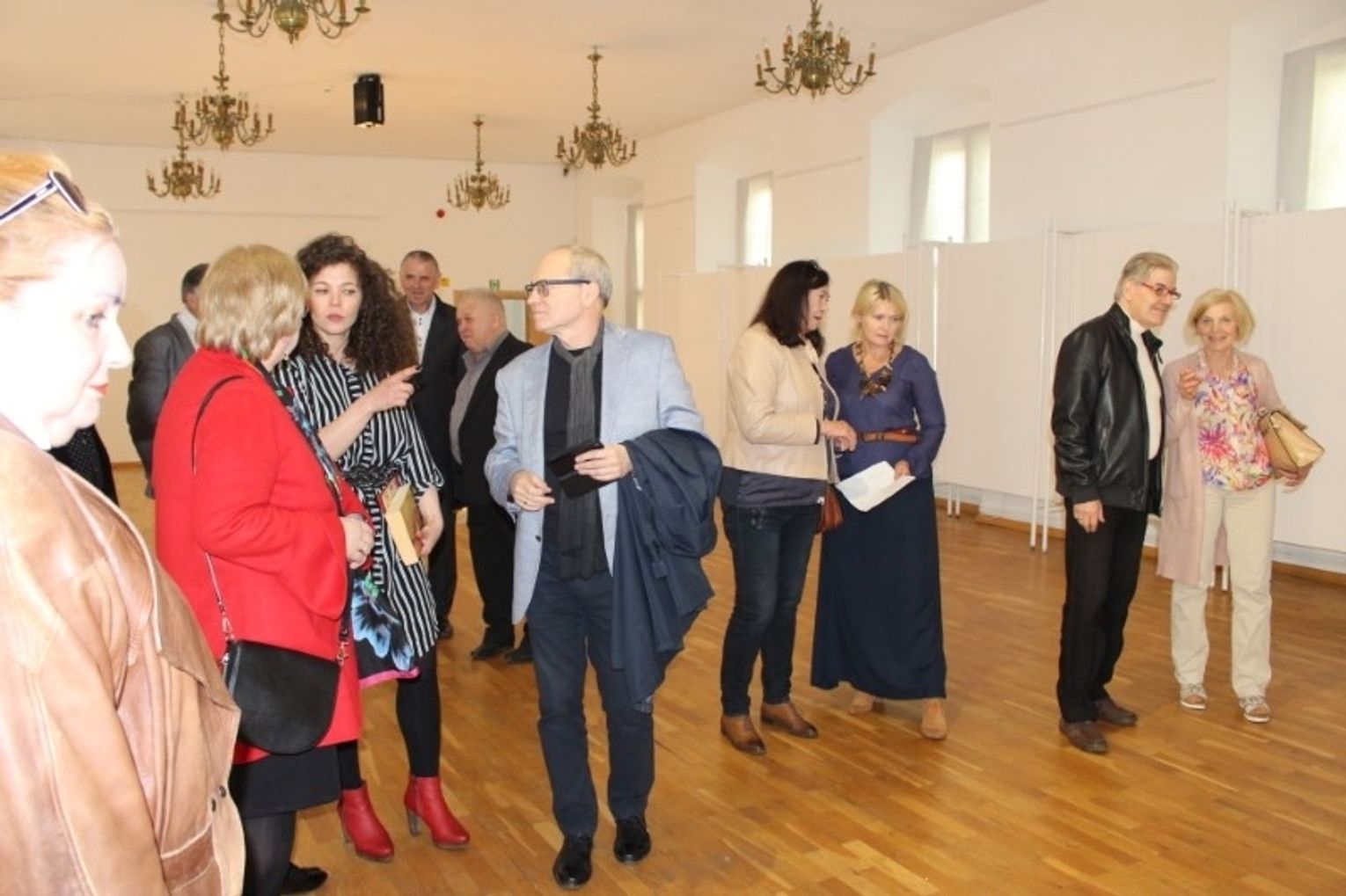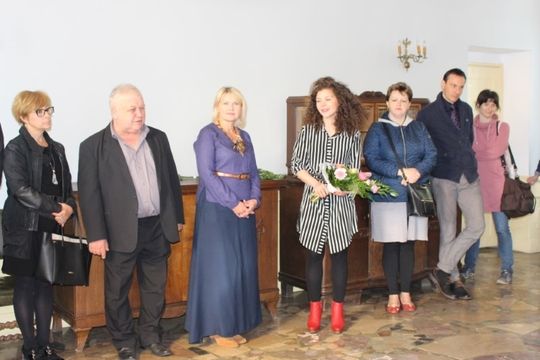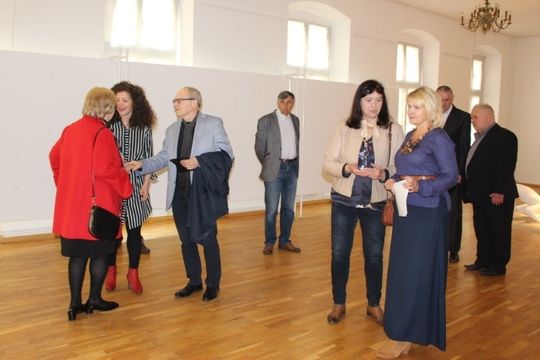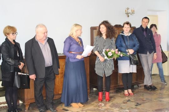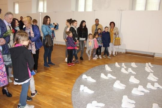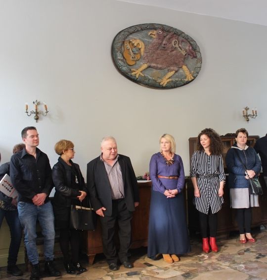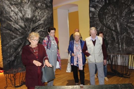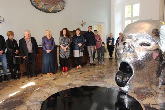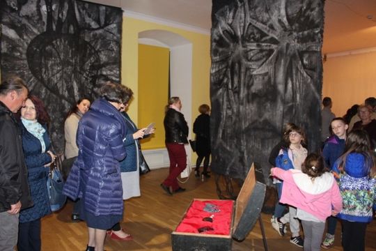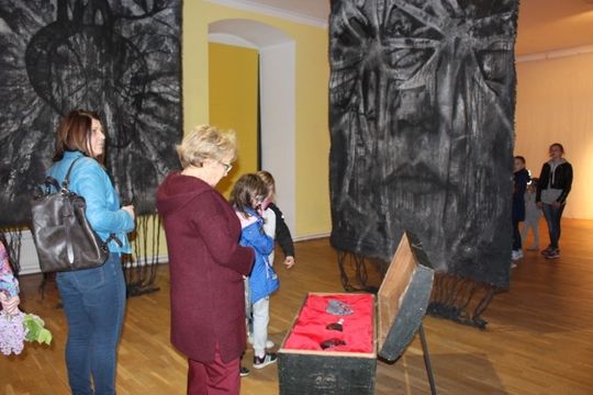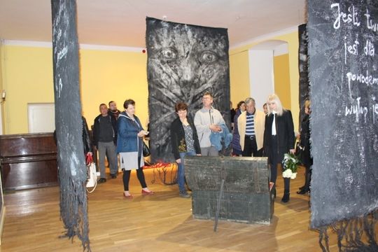 Sobotni wernisaż rozpoczął się przed głównym wejściem, gdzie „ przywitali” nas dwaj niebiescy chłopcy, beztrosko zajęci swoim szczęśliwym dzieciństwem. Radosna instalacja współbrzmiała z wiosennym słonecznym dniem. W półmroku dolnego holu, w którym oficjalnie rozpoczęliśmy wydarzenie, w centrum stworzonego przez nas kręgu wzbudziła zainteresowanie zgromadzonych głowa człowieka owinięta srebrną folią. Z otwartych ust wydobywała się ciemna otchłań. Pod zawartość wypływającą z wnętrza błyszczącej rzeźby artystka podłożyła czarną owalną elastyczną powierzchnię, która była kresem, przepastną głębią, zbrodnią, winą?