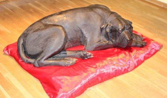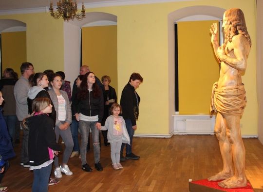 Następnie podążyliśmy ku kolejnej wyspie przywitani ciemnością rozświetloną w kluczowych punktach. To miejsce sacrum. Patrzył na nas z wysoka drewniany Chrystus cierpiący. Na podwieszonych czarnych całunach widoczne było jego odbicie na tle przejmujących odwiecznych sentencji. W gęstej przestrzeni znalazło się również miejsce dla ukochanego psa, którego, podobnie jak Chrystusa realistyczna rzeźba w trójkątnych, wyściełanych czerwonym materiałem sarkofagach przyciągała uwagę widza.