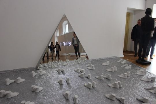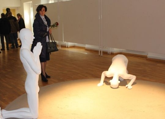 Piętro wyżej w galerii panował spokój i dominowała szarość bieli. Nad mandalą usypaną z bałtyckiego drobnego słonego piasku pochylają się, lub jej towarzyszą naturalnej wielkości postacie. Są to trzy modlące się figury – Chrześcijanina, Żyda i Muzułmanina. Instalacja ta była prezentowana z powodzeniem w 2018 roku jako „Modlitwa za Ukrainę” we Lwowskiej Narodowej Akademii Sztuk Pięknych. W drugim krańcu obszernej galerii zwraca naszą uwagę ogromne trójkątne lustro, które jednocześnie odmierza czas i odbija ludzkie stopy wtapiające się w jego pozbawioną emocji naturę. Obok stoi przerażony człowiek z poduszką. Chce opowiedzieć swoje sny.