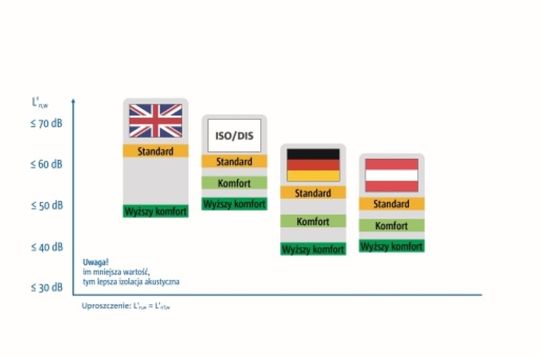 Różnice w określaniu izolacji akustycznej w Europie są duże. W Wielkiej Brytanii dopuszczalne wartości dla dźwięków uderzeniowych pochodzących z klatek schodowych są bardzo wysokie. Jak pokazały badania, mieszkańcom przeszkadza jednak nadmierny hałas dochodzący do ich apartamentów.