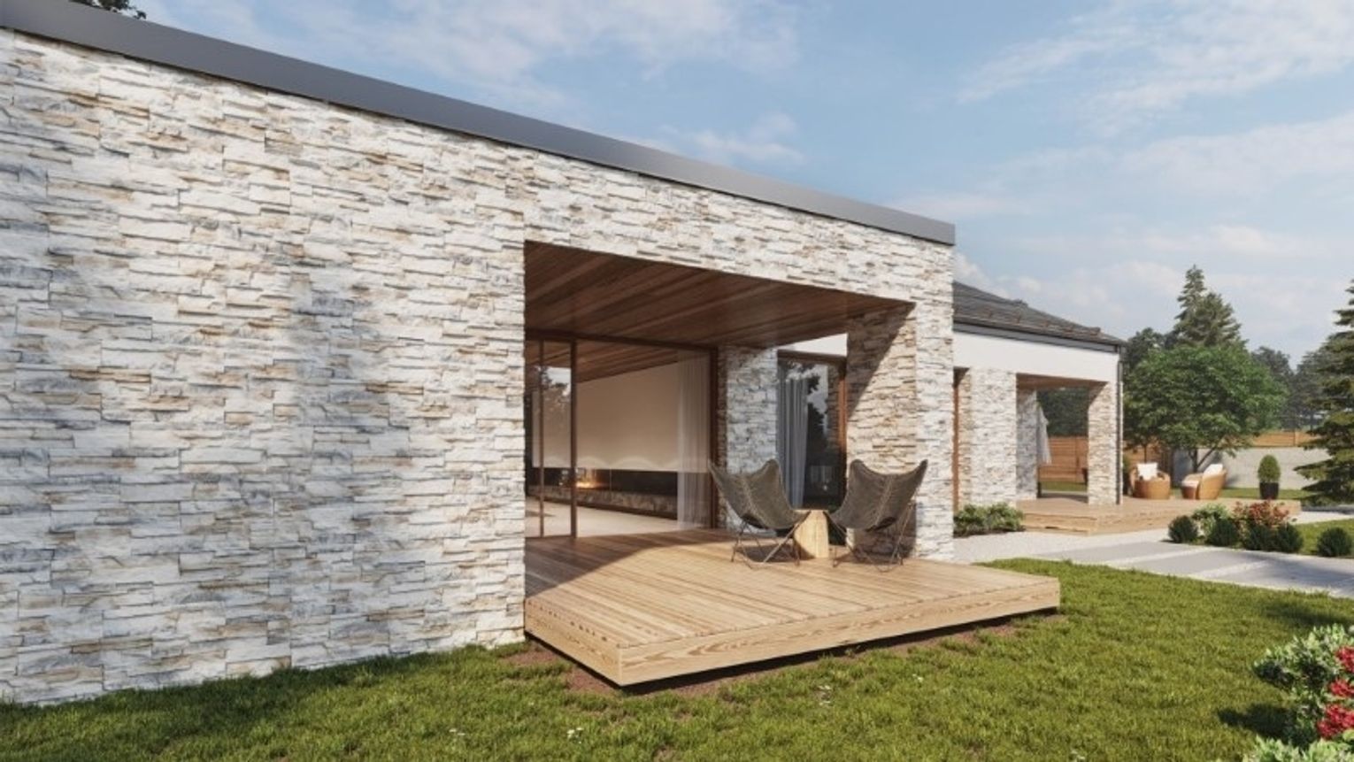 O aranżacji strefy wypoczynku warto zacząć myśleć już na etapie projektowania elewacji. Nawet jeśli dominującym materiałem wykończeniowym ma być tynk, ścianę domu, do której przylega taras, warto uszlachetnić, np. okładziną z kamienia lub płytek cegłopodobnych. Ciekawa faktura, współgrająca z kolorystyką wykończenia płyty tarasowej i alejek wydobędzie piękno przestrzeni ogrodowych, a przy tym pozwoli stworzyć niezwykły nastrój, który później dopełnią odpowiednio dobrane meble tarasowe oraz dodatki. Wieczorami zaś, gdy temperatura zazwyczaj spada o kilka stopni, kamień wypromieniuje ciepło nagromadzone w ciągu dnia. Za takim rozwiązaniem przemawiają nie tylko walory wizualne, ale również parametry czysto praktyczne, dzieki którym nasza przestrzeń tarasowa zachowa reprezentacyjny charakter.