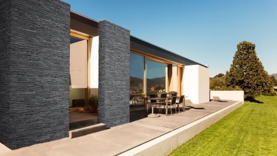 Przy projektach inspirowanych stylem współczesnym warto rozważyć płytkę w kolorze grafitowym, odwzorowującą strukturę drobnopokruszonego, oszlifowanego i ułożonego warstwowo łupka – Palermo. Barwa tego kamienia dekoracyjnego budzi skojarzenia z pyłem wulkanicznym, a jego ekskluzywna struktura pozwoli uzyskać elegancję i wysublimowany styl charakterystyczne dla sycylijskiej stolicy, wpisując się jednocześnie w nowoczesne trendy designerskie. Najbardziej spektakularny efekt osiągniemy zestawiając tę elewację z kontrastowymi jasnymi i drewnianymi elementami.
