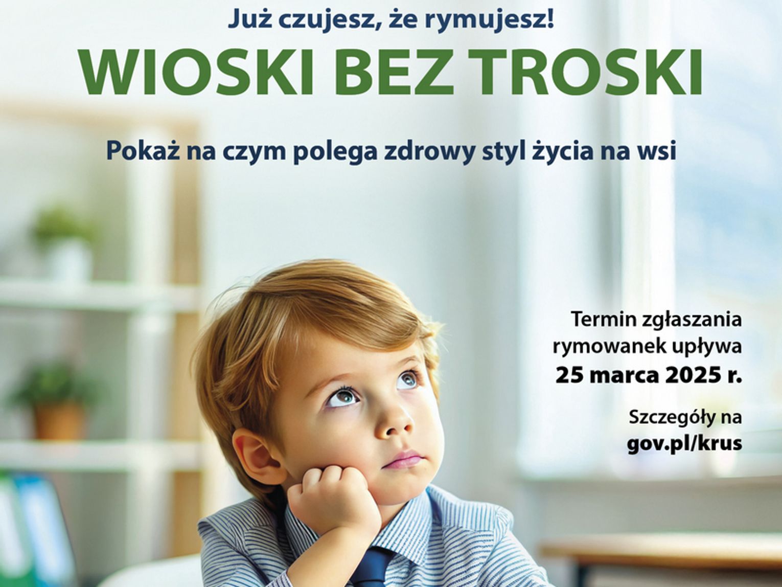 Kasa Rolniczego Ubezpieczenia Społecznego ogłosiła kolejną, VI edycję Ogólnopolskiego Konkursu dla Dzieci na Rymowankę o Bezpieczeństwie w Gospodarstwie Rolnym pod hasłem „Wioski bez troski”.