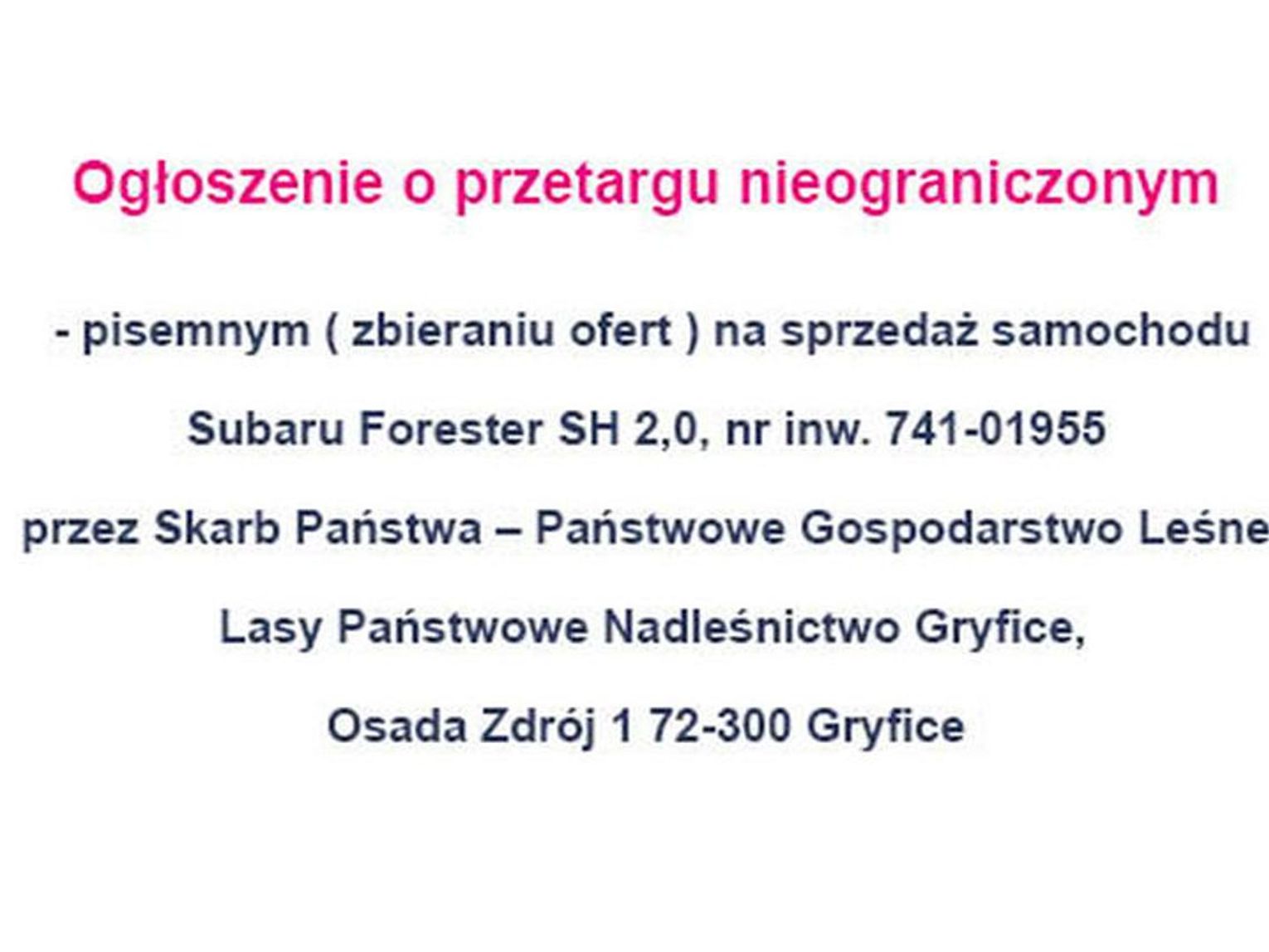 1. Skarb Państwa – Państwowe Gospodarstwo Leśne Lasy Państwowe Nadleśnictwo Gryfice ogłasza przetarg nieograniczony w formie przetargu pisemnego (zbierania ofert) na sprzedaż samochodu Subaru Forester SH 2,0, o nr inw. 741-01955.