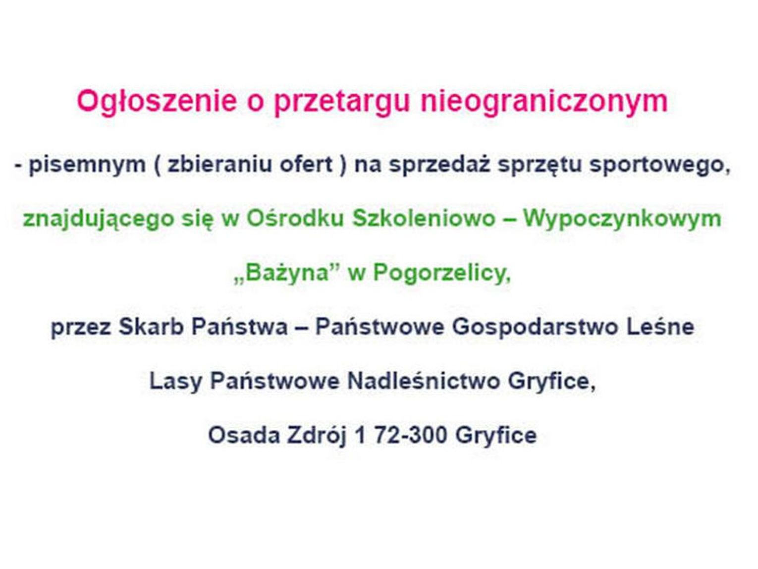 1. Skarb Państwa – Państwowe Gospodarstwo Leśne Lasy Państwowe Nadleśnictwo Gryfice ogłasza przetarg nieograniczony w formie przetargu pisemnego (zbierania ofert) na sprzedaż sprzętu sportowego: