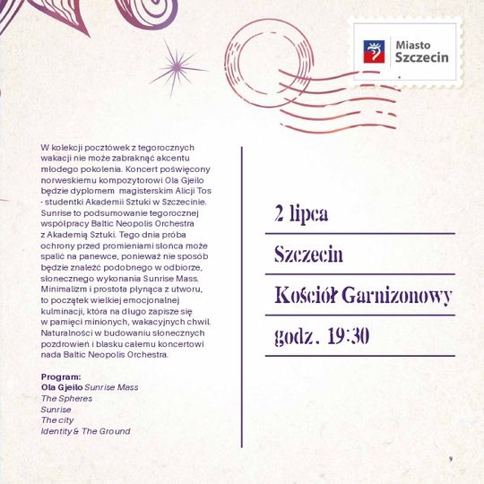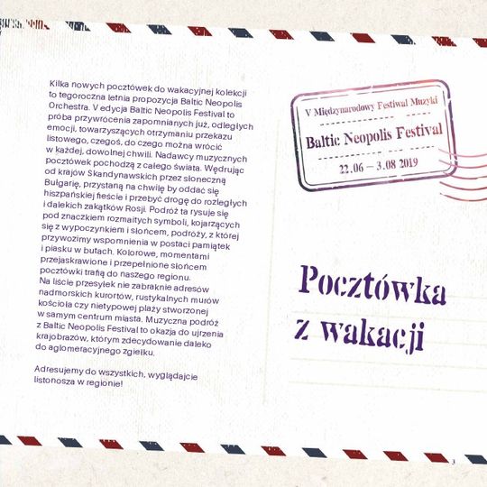 Baltic Neopolis Orchestra pragnie zaadresować do słuchaczy 13 pocztówek, które zostaną nadane z zakątków naszego regionu: nadmorskich kurortów, rustykalnych murów kościoła czy nietypowej plaży stworzonej w samym centrum miasta. Pocztówki będzie można kolekcjonować w Szczecinie, Wolinie, Gryfinie, Złocieniecu, Świnoujściu, Międzyzdrojach czy Kołobrzeg.