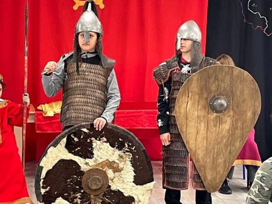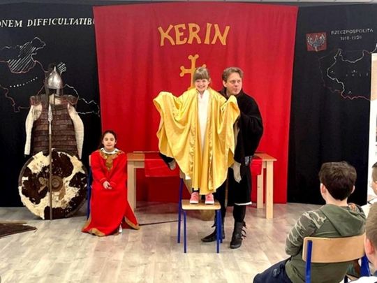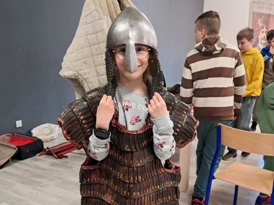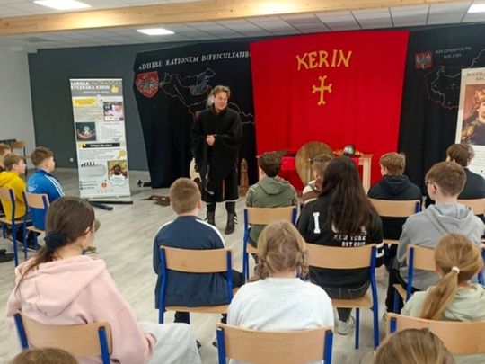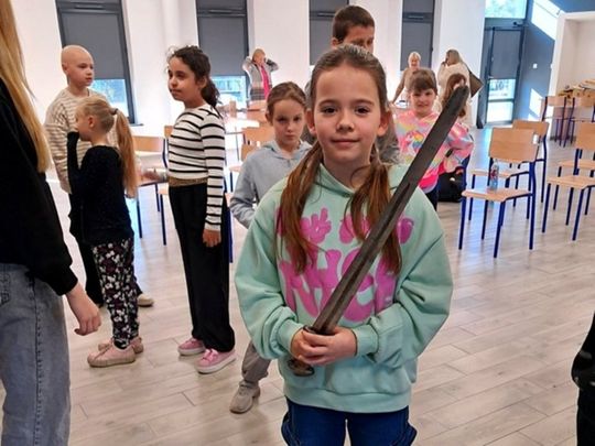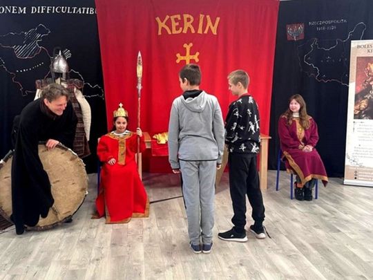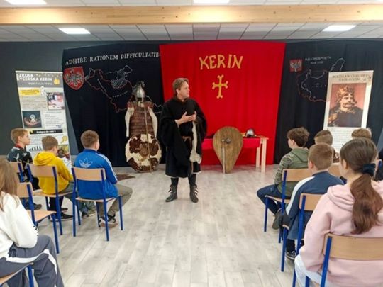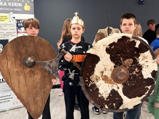 W ramach tej wyjątkowej i nietypowej lekcji historii uczniowie mieli okazję przenieść się w czasy średniowieczne i poznać fascynującą postać Bolesława Chrobrego – pierwszego koronowanego władcy Polski. Podczas spotkania rycerze z Bractwa KERIN opowiedzieli o tym, jak doszło do koronacji króla, dlaczego jego panowanie jako monarcha koronowany trwało tak krótko, oraz jakie relacje łączyły go ze św. Wojciechem – misjonarzem, męczennikiem i bliskim przyjacielem władcy. Dzieci i młodzież aktywnie uczestniczyli w inscenizacjach historycznych, wcielając się w role dawnych wojów, możnowładców i duchownych. Uczniowie mieli okazję przymierzyć repliki średniowiecznych strojów oraz zbroi, a także wziąć do rąk miecze, tarcze i szable, co dostarczyło im nie tylko wiedzy, ale i sporej dawki emocji.