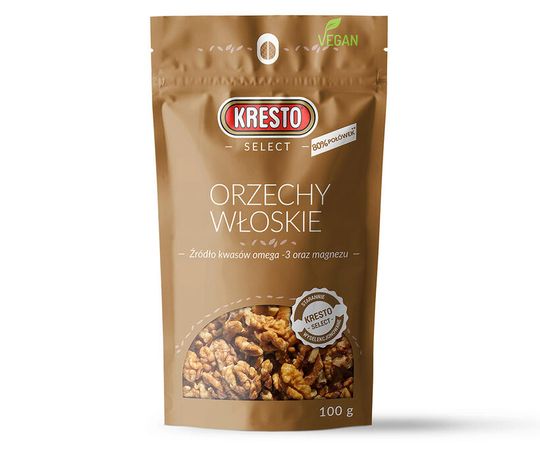 Orzechy włoskie KRESTO SELECT to 80% połówek starannie wyselekcjonowanych orzechów, co czyni je idealnym wyborem zarówno do przekąsek, wypieków, jaki do efektownych dekoracji wielkanocnych ciast. Produkt będący źródłem kwasów omega-3 oraz magnezu dostępny jest w opakowaniach