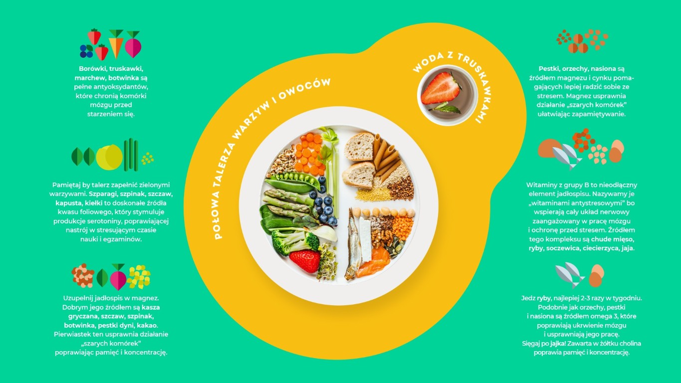 Warzywa i owoce są doskonałym źródłem błonnika, który skutecznie spowalnia wchłanianie glukozy, utrzymując ją na optymalnym poziomie, co mózg bardzo dobrze toleruje. Grupa tych różnorodnych produktów jest nieocenionym źródłem antyoksydantów, czyli związków, które chronią komórki mózgu przed starzeniem się. Czas egzaminów i matur to wiosna, a w tym okresie mamy już dostęp do truskawek, borówek, jagody kamczackiej, młodych buraków z botwinką, marchewki, szparagów czy szpinaku. Wszystkie one będą skutecznie walczyć z wolnymi rodnikami i tworzyć „parasol ochronny” dla komórek naszego mózgu. Co ważne, mózg nie magazynuje substancji odżywczych, dlatego o prawidłowy talerz żywieniowy należy dbać codziennie.