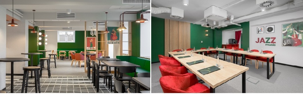W przestrzeni dominują głębokie odcienie bordo i zieleni, które w połączeniu z nastrojowym oświetleniem budują elegancki, a zarazem przytulny klimat. Barwne plakaty w przestrzeniach wspólnych i grafiki autorstwa Katarzyny Boguckiej-Nioska znajdujące się w pokojach, podkreślają muzyczny nastrój miasta, a detale inspirowane instrumentami dopełniają całości, tworząc miejsce, w którym kultura jazzu współgra z komfortem, funkcjonalnością i nowoczesnym designem.