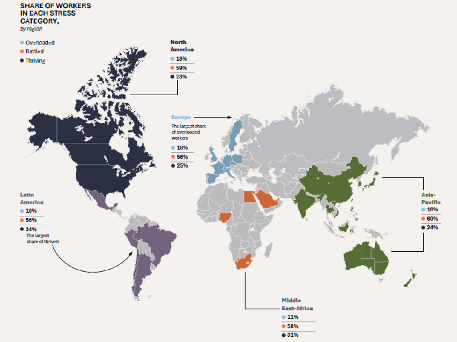 Prym pod tym względem wiedzie Ameryka Łacińska, gdzie 34% pracowników twierdzi, że rozwijają się w pracy, a jedynie 10 proc. czuje się przeciążonych. Na drugim biegunie znalazła się Europa ze wskaźnikiem 19 proc. przeciążenia. Najgorzej pod tym względem jest w Szwecji (24 proc.) i Czechach (23 proc.). Polska wyróżnia się na tym tle – tylko 13 procent pracowników czuje się przytłoczonych stresem, a co trzeci (32 proc.) kwalifikuje swój stres zawodowy jako mobilizujący! Podobnie wysoki wynik zanotowano jeszcze tylko w Hiszpanii (31 procent). Mimo to, w ciągu roku odsetek mobilizującego stresu w Polsce spadł o 6 punktów.
