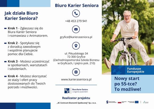 Biuro Karier Seniora w powiecie gryfickim prowadzi „4C Centrum Ekonomii Społecznej” Sp. z o.o. w ramach projektu „Biuro Karier Seniora w regionie szczecińskim”, dofinansowanego ze środków Unii Europejskiej (Fundusze Europejskie dla Pomorza Zachodniego 2021–2027, EFS+, nr umowy FEPZ.06.03-IP.01-0022/24-00).