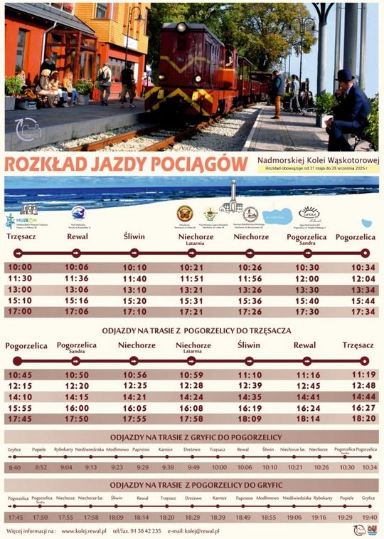 Uwaga: W sobotę, 31.05.2025 r. wprowadzony zostanie nowy rozkład jazdy, w którym pojawi się dodatkowy kurs. Ostatni pociąg z Trzęsacza do Pogorzelicy odjedzie o godz. 17:00, a pociąg powrotny do Gryfic odjedzie z Pogorzelicy o godz. 17:45. Więcej informacji na www.kolej.rewal.pl