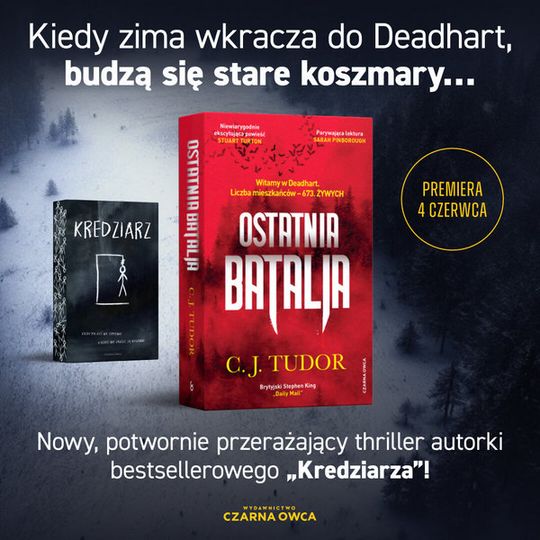 „Ostatnia batalia” to przyprawiające o dreszcze, mrożące krew w żyłach mistrzowskie połączenie thrillera i horroru, z mrokiem i niebezpieczeństwem wylewającym się z każdej strony. C.J. Tudor, autorka bestsellerowego „Kredziarza” przenosi czytelników do pozornie spokojnego miasteczka na mroźnej Alasce, które pod grubą warstwą śniegu skrywa mroczne sekrety. Uznawana za mistrzynię makabry brytyjska pisarka tworzy atmosferę tak gęstą, że można ją kroić nożem. Klaustrofobiczny klimat odciętego od cywilizacji miasteczka w czasie zamieci śnieżnej dopełnia obecność kolonii wampirów, co dodaje tej i tak już niezwykłej historii dodatkowego smaczku.