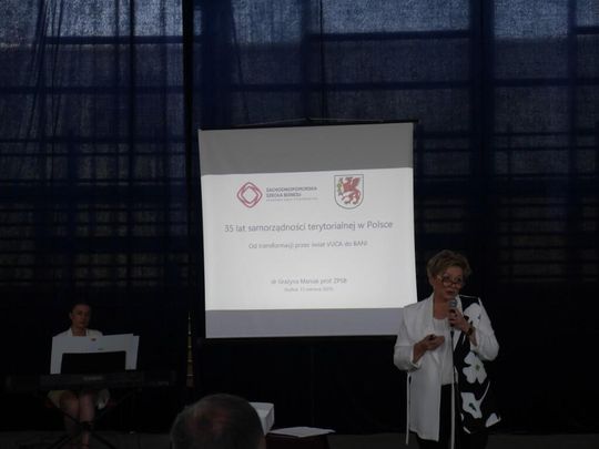 O bardziej współczesnych wyzwaniach jakie pojawiają się przed Samorządami w tym gryfickimi w prelekcji „35 lat samorządności Od transformacji poprzez świat VUCA do BANI” mówiła dr Grażyna Maniak dziekan Zachodniopomorskiej Szkoły Biznesu w Gryficach.
