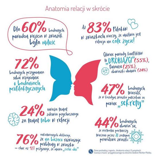 Związki to coś więcej niż wspólne mieszkanie czy status "w relacji". To codzienność przeplatana czułością, zmęczeniem, rozmowami i milczeniem. Czasem uskrzydlają, innym razem wystawiają na próbę. W świecie, który ciągle pędzi, coraz trudniej o prawdziwe spotkanie - twarzą w twarz. Raport „Anatomia relacji. O związkach twarzą w twarz” [1], przygotowany na zlecenie Gedeon Richter Polska, zagląda pod powierzchnię - tam, gdzie rodzą się potrzeby, frustracje i tęsknoty. Pokazuje, jak naprawdę kochają dziś Polki i Polacy. Czy się wspieramy? Czy potrafimy rozmawiać o emocjach? Czy jesteśmy razem czy tylko obok siebie? To zaproszenie do szczerej rozmowy - nie tylko o związkach, ale też o nas samych.