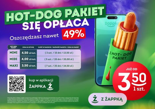 Już teraz każdy użytkownik aplikacji Żappka może aktywować kupon na jeden z wybranych trzech pakietów, na wszystkie rodzaje hot dogów (prócz wersji max), oszczędzając nawet do 49% (regularna cena mieści się w przedziale 6,99 zł – 7,99 zł):