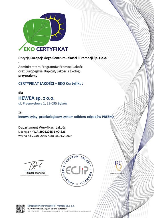 HEWEA Sp. z o.o. otrzymała prestiżowy CERTYFIKAT JAKOŚCI – EKO Certyfikat przyznawany przez Europejskie Centrum Jakości i Promocji oraz Europejską Kapitułę Jakości i Ekologii. Wyróżnienie zostało przyznane za innowacyjny, proekologiczny system odbioru odpadów PRESKO, który już dziś uznawany jest za jedno z najbardziej kompleksowych i nowoczesnych rozwiązań w dziedzinie inteligentnej gospodarki komunalnej.