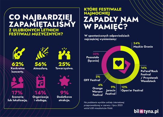 Dzięki badaniu przeprowadzonemu wśród 658 Polaków udało się uchwycić również emocjonalne aspekty festiwalowych doświadczeń. Co najmocniej zapadło ankietowanym w pamięć na najlepiej wspominanych festiwalach? Respondenci najczęściej wskazywali: