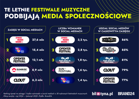 najnowszym raporcie przygotowanym przez biletyna.pl we współpracy z Brand24 i agencją Elephate, przeanalizowano 30 wybranych letnich festiwali muzycznych w Polsce – pod kątem ich obecności w mediach społecznościowych, liczby wzmianek w internecie, popularności w wyszukiwarkach i emocjonalnego wpływu na uczestników.