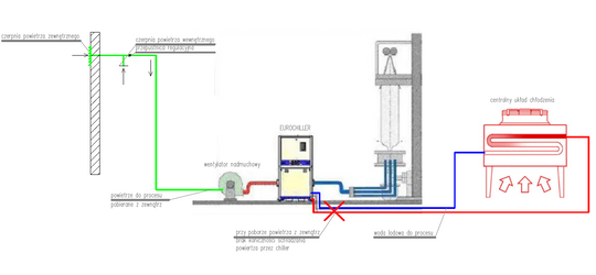 To technologia wykorzystująca naturalnie chłodne powietrze zewnętrzne do schładzania powietrza procesowego w zakładach przemysłowych. Zamiast korzystać z energochłonnych agregatów chłodniczych i sprężarek, system bazuje na prostym mechanizmie mieszania powietrza – wewnętrznego i zewnętrznego – z inteligentnym sterowaniem. Gdy temperatura na zewnątrz spada poniżej określonego progu (np. 15°C), system automatycznie zwiększa udział chłodnego powietrza z zewnątrz aż do 100%. Dzięki temu możliwe jest naturalne chłodzenie procesu technologicznego – bez potrzeby zużywania dużych ilości energii elektrycznej.