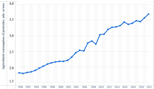 Od 1990 roku światowe stosowanie pestycydów w rolnictwie stale rosło, osiągając 3,69 mln ton metrycznych w 2022 roku. Pestycydy to substancje chemiczne biologicznie czynne. Obejmują one szeroką gamę produktów, w tym herbicydy, fungicydy, bakteriocydy, insektycydy, regulatory wzrostu roślin i rodentycydy. Spośród nich najczęściej stosowane są herbicydy, przede wszystkim do zwalczania niechcianych roślin. W 2022 r. globalne stosowanie herbicydów osiągnęło 1,94 mln ton metrycznych.