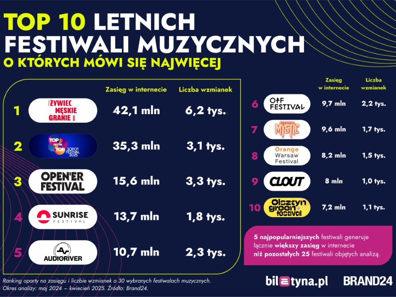 Numerem 1 został festiwal Męskie Granie, który osiągnął najwyższy zasięg w sieci (ponad 42 mln odbiorców) i największą liczbę wzmianek w okresie od maja 2024 r. do kwietnia 2025 r. Tuż za nim uplasowały się TOP of the TOP Sopot Festival oraz Open’er Festival.