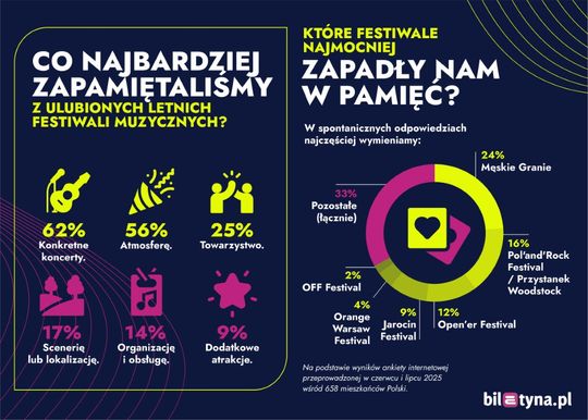 Dzięki badaniu przeprowadzonemu wśród 658 Polaków udało się uchwycić również emocjonalne aspekty festiwalowych doświadczeń. Co najmocniej zapadło ankietowanym w pamięć na najlepiej wspominanych festiwalach? Respondenci najczęściej wskazywali: