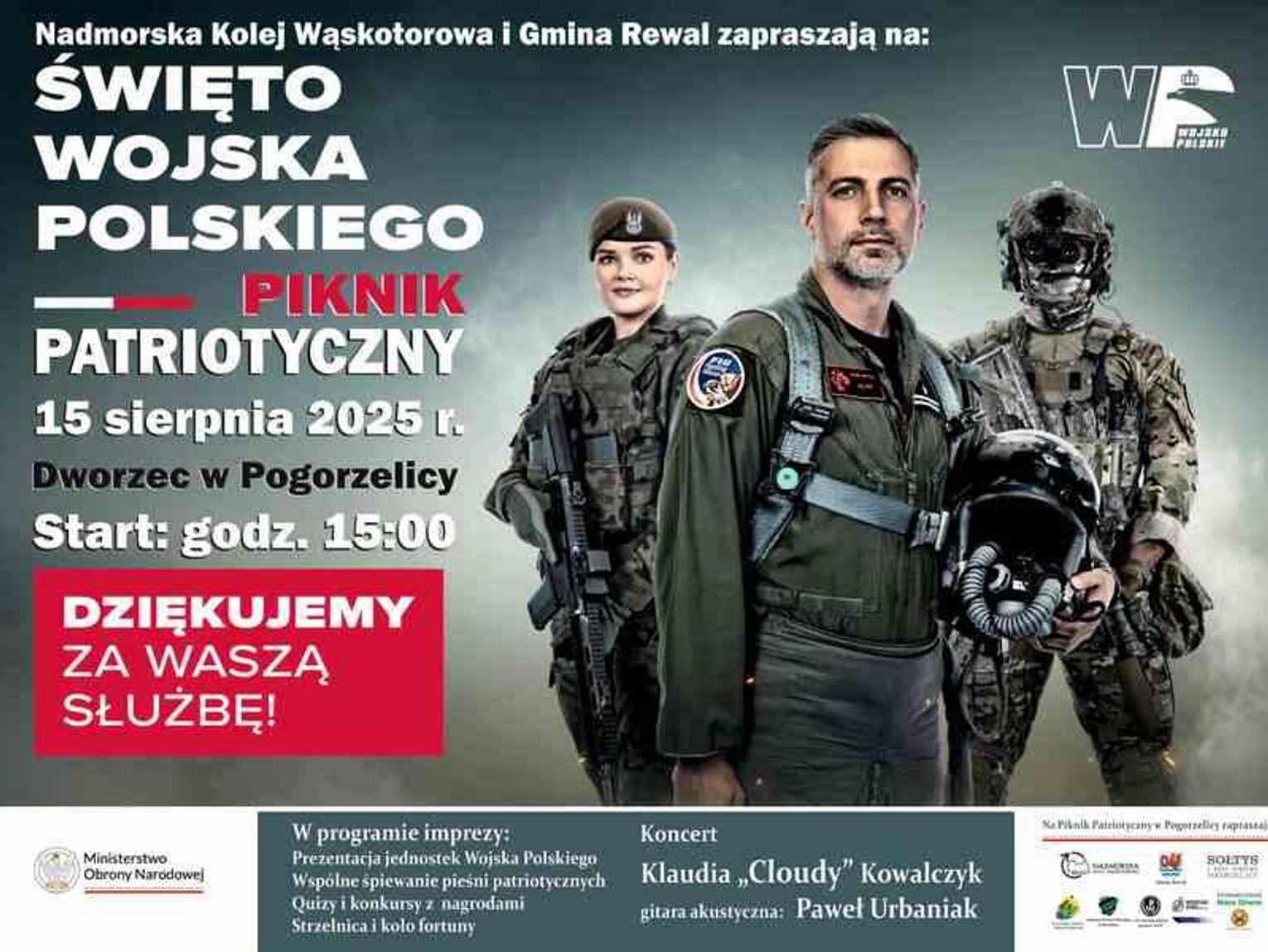 W czwartek, 15 sierpnia 2025 r. Gmina Rewal, Nadmorska Kolej Wąskotorowa oraz sołtys i Rada Sołecka Pogorzelicy zapraszają na Piknik Patriotyczny z okazji Święta Wojska Polskiego, który odbędzie się na terenie zabytkowego dworca kolejowego w Pogorzelicy. Początek imprezy - godz. 15:00.