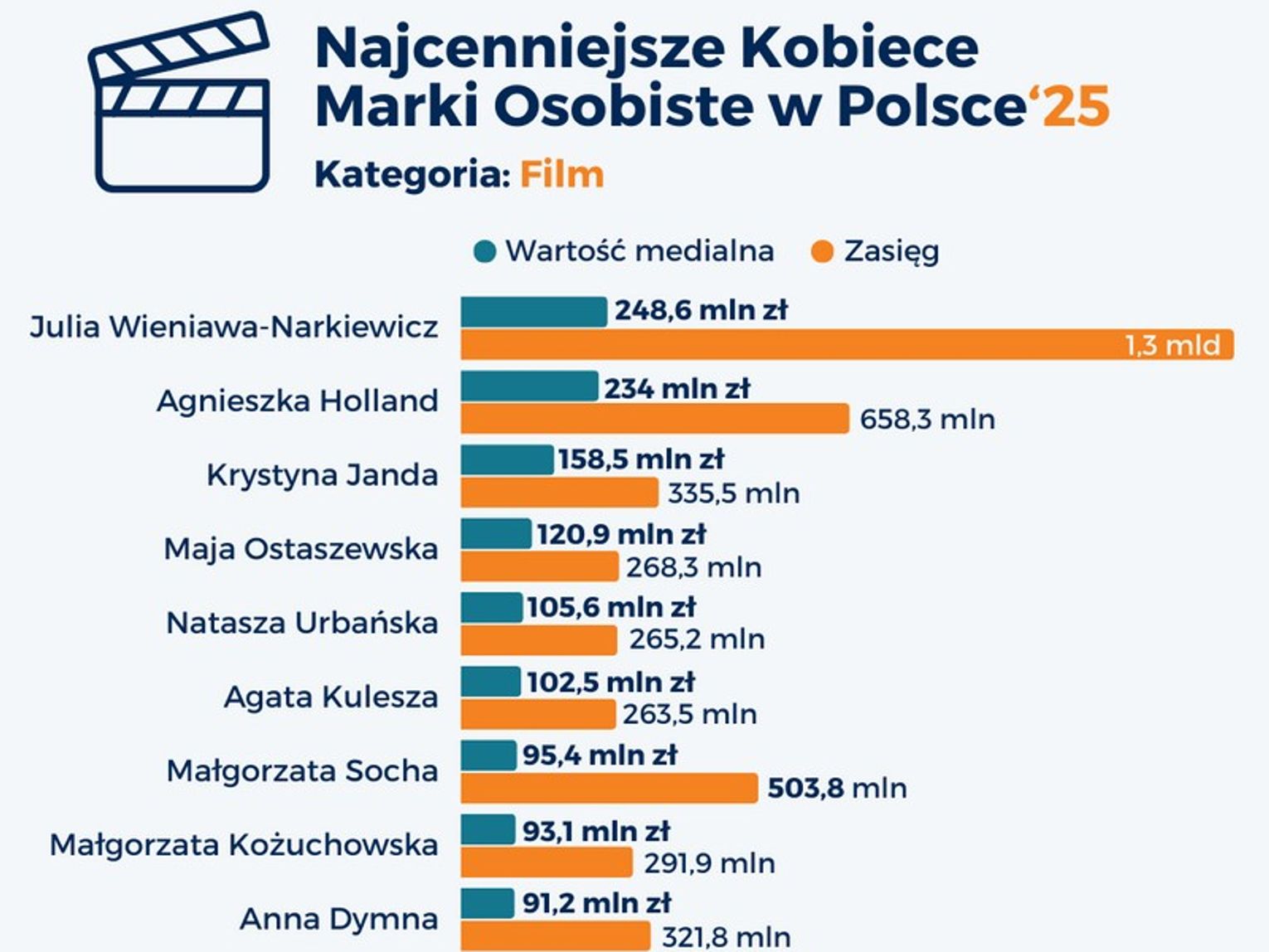 W kategorii Film rankingu 100 Najcenniejszych Kobiecych Marek Osobistych w Polsce najwyżej uplasowała się Julia Wieniawa-Narkiewicz – wartość medialna jej marki wyniosła 248,6 mln zł, a zasięg przekroczył 1,3 mld kontaktów z przekazem. Wynik ten dał jej również ósme miejsce spośród wszystkich badanych kategorii corocznego rankingu. Drugie miejsce wśród najcenniejszych kobiet filmu zajęła Agnieszka Holland z wynikiem 234 mln zł i zasięgiem 658,3 mln, a trzecie – Krystyna Janda, której marka osiągnęła wartość 158,5 mln zł i 335,5 mln kontaktów z przekazem. Cykliczne zestawienie jest przygotowywane przez Instytut Monitorowania Mediów dla magazynu „Forbes Women” na podstawie danych analitycznych dotyczących ekspozycji badanych marek osobistych we wszystkich typach mediów.