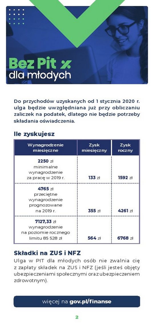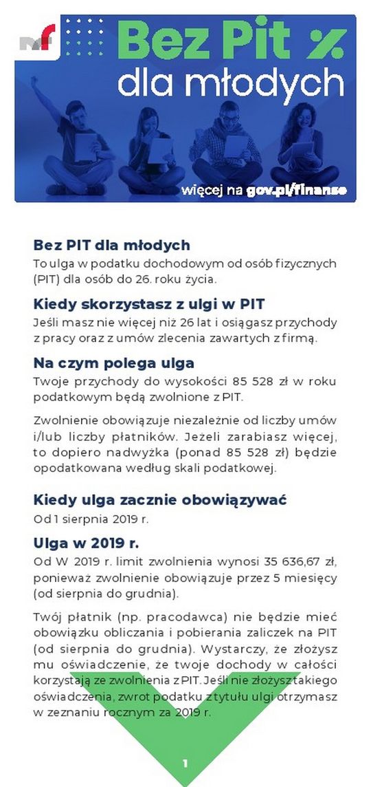 Ustawa o zmianie ustawy o podatku dochodowym od osób fizycznych, ustawy o świadczeniach rodzinnych oraz ustawy o świadczeniach opieki zdrowotnej finansowanych ze środków publicznych jest realizacją zapowiedzi zniesienia podatku PIT dla pracujących do ukończenia 26. roku życia. Dzięki tej zmianie młode osoby będą miały zapewniony lepszy start na rynku pracy.