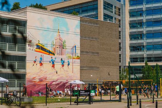 Korzystając z boiska do siatkówki trudno nie zwrócić uwagi na nowy mural zdobiący elewację usytuowanego obok budynku. Przedstawia on scenkę gry w siatkówkę na tle znanych elementów stołecznego krajobrazu, takich jak Pałac Kultury czy warszawski tramwaj, ale co ważne – zawiera również charakterystyczne budynki z portfolio Adgar Poland w Stolicy, symbolicznie łącząc je w jedną, spójną miejską opowieść. „Nasz mural nie jest jedynie ozdobą tego miejsca, to także nasza wizualna deklaracja przynależności do miasta i jego energii” – dodaje Monika Szelenberger.