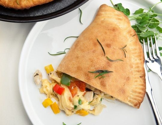 Drożdże rozkruszyć z cukrem, odrobiną mąki i mlekiem. Margarynę posiekać z resztą mąki, dodać sól, jajka, żółtka, śmietanę i wyrośnięte drożdże. Wyrobić ciasto i odstawić do wyrośnięcia. Indyka i cebulę pokroić w kostkę i podsmażyć na oleju. Dodać pokrojony czosnek, paprykę i pomidory. Doprawić solą, pieprzem, ziołami prowansalskimi, chwilę poddusić. Farsz przestudzić i wymieszać z żółtym serem. Z ciasta uformować 2 duże krążki, położyć na natłuszczoną blaszkę do pieczenia i nałożyć farsz. Uformować pierogi, dokładnie sklejając brzegi i posmarować roztrzepanym białkiem. Piec w temperaturze 180°C, do uzyskania złotego koloru. Podawać z ulubionym sosem.