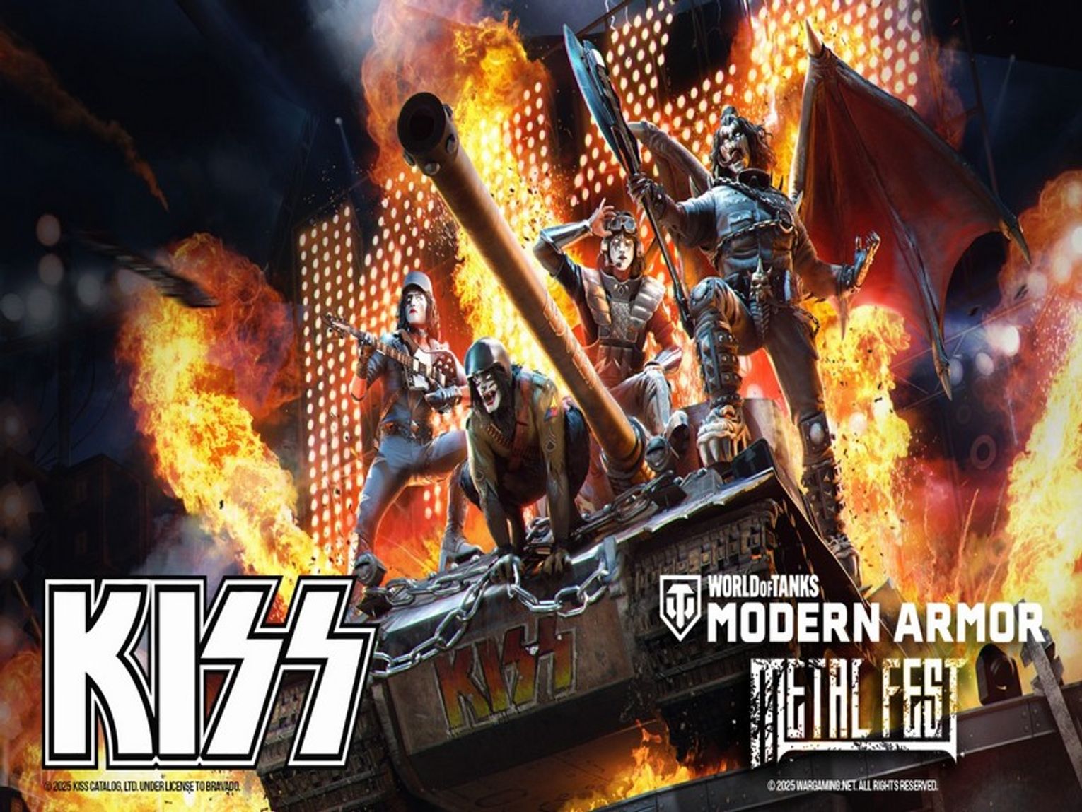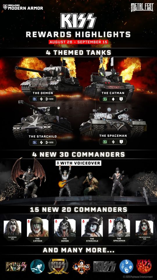 W tym roku, Metal Fest prezentuje cztery unikatowe czołgi Premium, każdy inspirowany kultowymi członkami KISS: The Demon, The Starchild, The Spaceman oraz The Catman. Te maszyny to prawdziwe wcielenie energii zespołu. The Demon włada piekielnym miotaczem ognia, The Starchild to niszczycielska maszyna zdolna do oddawania trzech strzałów w serii, The Spaceman przebija się przez pole bitwy dzięki rakietowym dopalaczom, zaś The Catman charakteryzuje się zwinnością i szybkością. Na bis, dla graczy, którzy wybiorą te czołgi Premium w garażu, z głośników rozbrzmi kultowe „Rock and Roll All Nite”.
