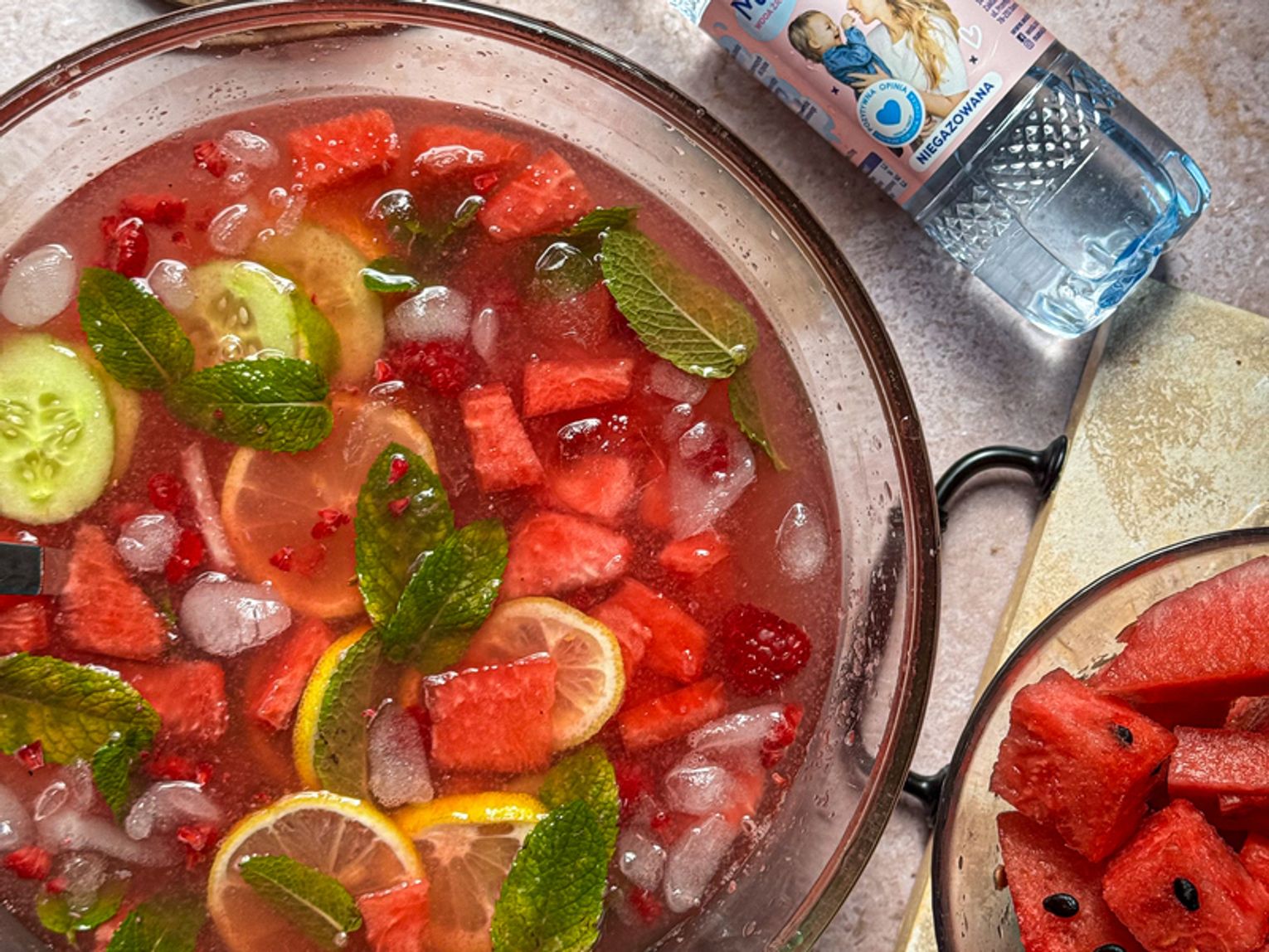 Do dzbanka wlej arbuzowy sok, dodaj wodę i wymieszaj. Wrzuć miętę, plasterki cytryny, plasterki ogórka, opcjonalnie kawałki arbuza lub zamrożone wcześniej maliny.