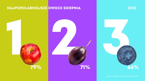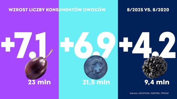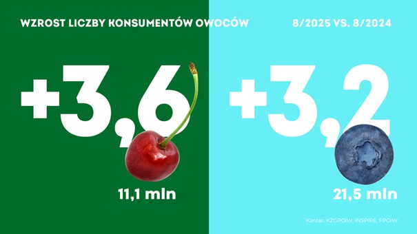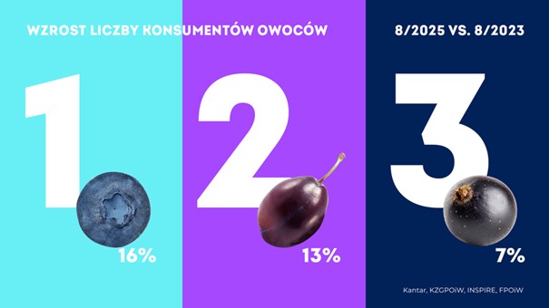 Śliwki zyskały 7,1 mln, co dało w sierpniu br. poziom 23 mln konsumentów. Borówki zyskały 6,9 mln konsumentów, przypomnijmy, w sierpniu br. jadło je 21,5 mln Polaków. Na trzecim miejscu podium jeżyny - 4,2 mln nowych konsumentów. W sierpniu 2025 roku jeżyny jadło już 9,4 mln osób.