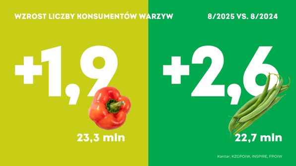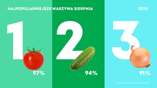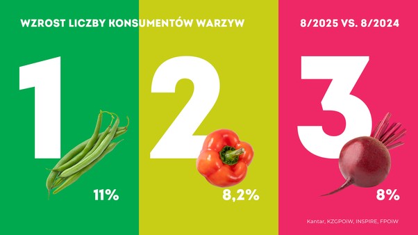 Jeszcze nigdy tak wielu Polaków nie jadło tak wielu różnych warzyw, jak w lecie 2025 roku. Sierpniowe deklaracje konsumpcji wszystkich najpopularniejszych gatunków były najwyższe w historii monitoringu Kantar Polska. Rekordowy był również wskaźnik różnorodności spożycia warzyw i owoców przez Polaków. Wśród najpopularniejszych gatunków sierpnia znalazły się pomidory, ogórki i cebula. Najwyższe wzrosty „sierpień do sierpnia” zanotowały fasolka szparagowa, papryka i buraki ćwikłowe.