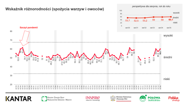 Wskaźnik różnorodności spożywanych przez Polaków warzyw osiągnął wartość 60,1 pkt., co jest najlepszym sierpniowym wynikiem w historii (realizowanego w sposób ciągły monitoringu konsumpcji warzyw i owoców).