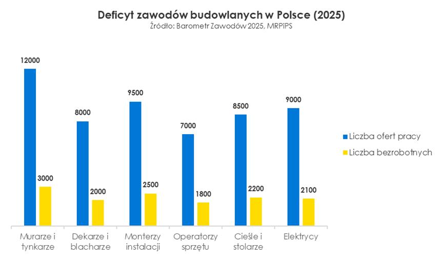 Najnowszy Barometr Zawodów 2025 uznał kilkadziesiąt profesji za deficytowe, wśród nich znalazły się kluczowe dla budownictwa zawody takie jak murarze i tynkarze, monterzy instalacji budowlanych, dekarze czy operatorzy sprzętu. Problem pogłębia się z powodu luki pokoleniowej, doświadczeni pracownicy stopniowo odchodzą na emerytury, a młodych kandydatów do pracy w branży wciąż jest zbyt mało. Tymczasem zapotrzebowanie na wykwalifikowanych specjalistów stale rośnie.