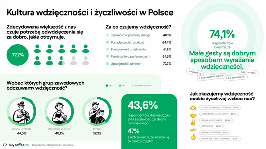 „Wyniki badań jednoznacznie wskazują, że Polacy pragną wyrażać wdzięczność nie tylko w obliczu wyjątkowych wydarzeń, ale również doceniając codzienne usługi, które podnoszą komfort życia. Wirtualna kawa stanowi pomost łączący głęboko zakorzenioną kulturę życzliwości z nowoczesnymi rozwiązaniami cyfrowymi. Jest to szybki, intuicyjny i zgodny z polską tradycją sposób na wyrażenie podziękowania” - podsumowuje Piotr Kędzia, Prezes Zarządu Coffee Media sp. z o.o. właściciela serwisu www.buycoffee.to